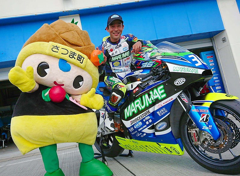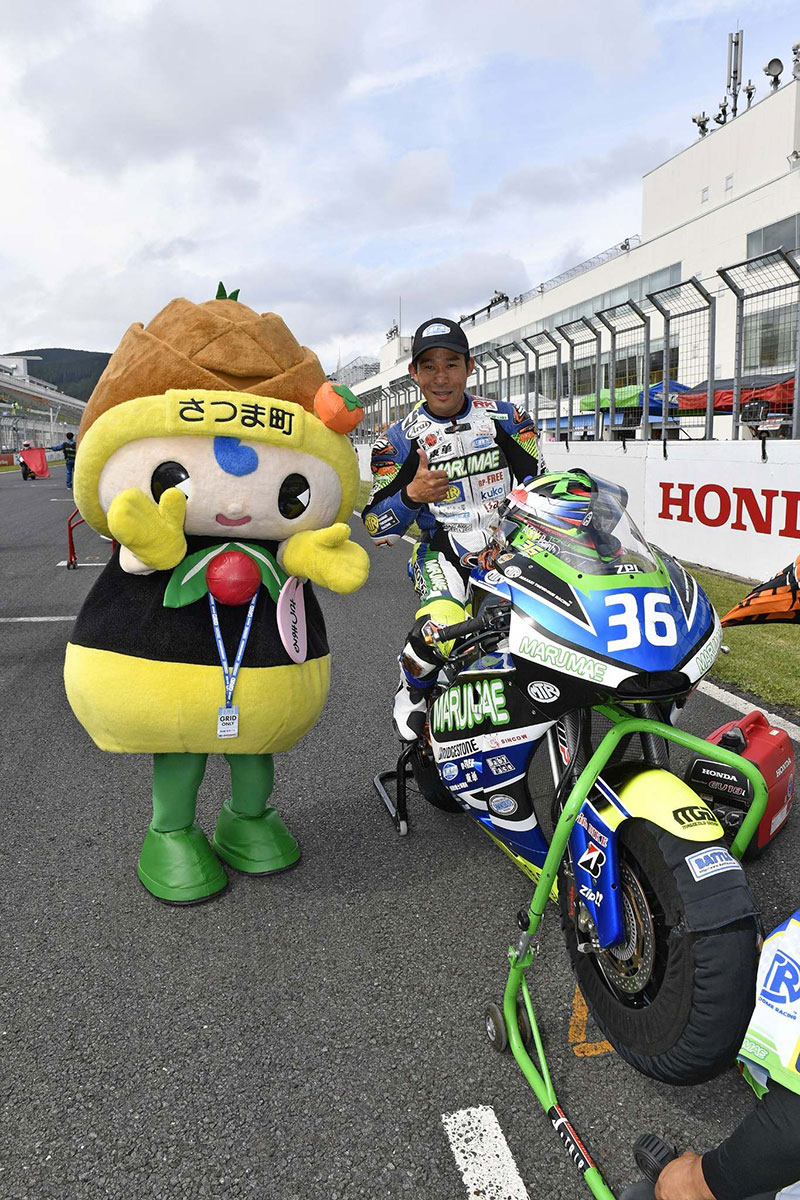 秋晴れとなったオートポリス。地元鹿児島県さつま町で”さつま観光夢大使”を委嘱されている徳留。町のPRの場になればと今年も地元のキャラクター”さつまるちゃん”をサーキットに招待。ピットウォークとグリッドにはゆるキャラの登場もあり注目度も高い。