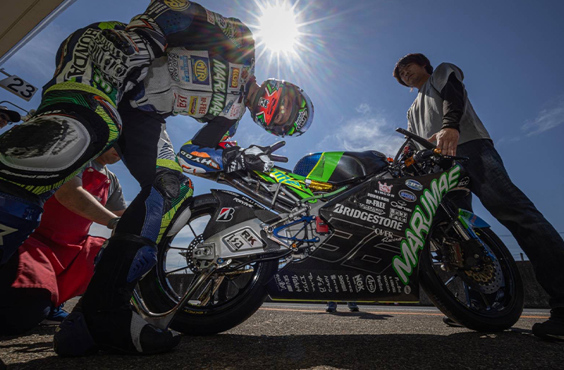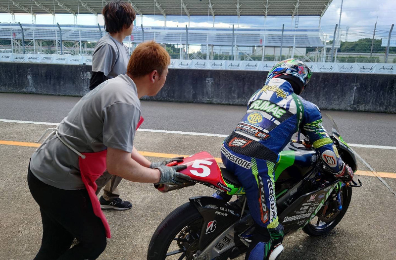 一本目の走行。走りに固さを見せながらも走れることが確認出来ると、2本目には大幅にタイムアップ。身体の動きとマシンとの調和も取れ始め、土曜日にはまずまずの15番手タイムで2日間の走行を終える。今大会は日曜日に予選と決勝を行うワンデーでの開催。終始天気に恵まれた筑波サーキット。梅雨の晴れ間の30度を超える暑さである。